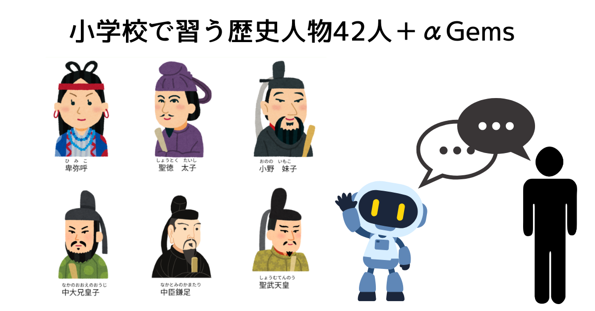 小学校で習う歴史人物42人+α Gems Gems X Facebook はてブ LINE Pinterest コピー 2026.02.10 小学校で習う歴史人物になりきったAIになんでも質問してみよう?例えば織田信長Gemsに、明智光秀をどう思っていますか?とか長篠の戦に点数をつけるとしたら何点ですか?とか。どんな答えが返ってくるかな?そしてその答えは本当に正しいのかな?調べたい人物の画像をクリックしてね! なお、このサイトにつかわれているイラスト画像は、いらすとやさん、及びイラストACさんのものを使用しております。素敵なイラストありがとうございます。