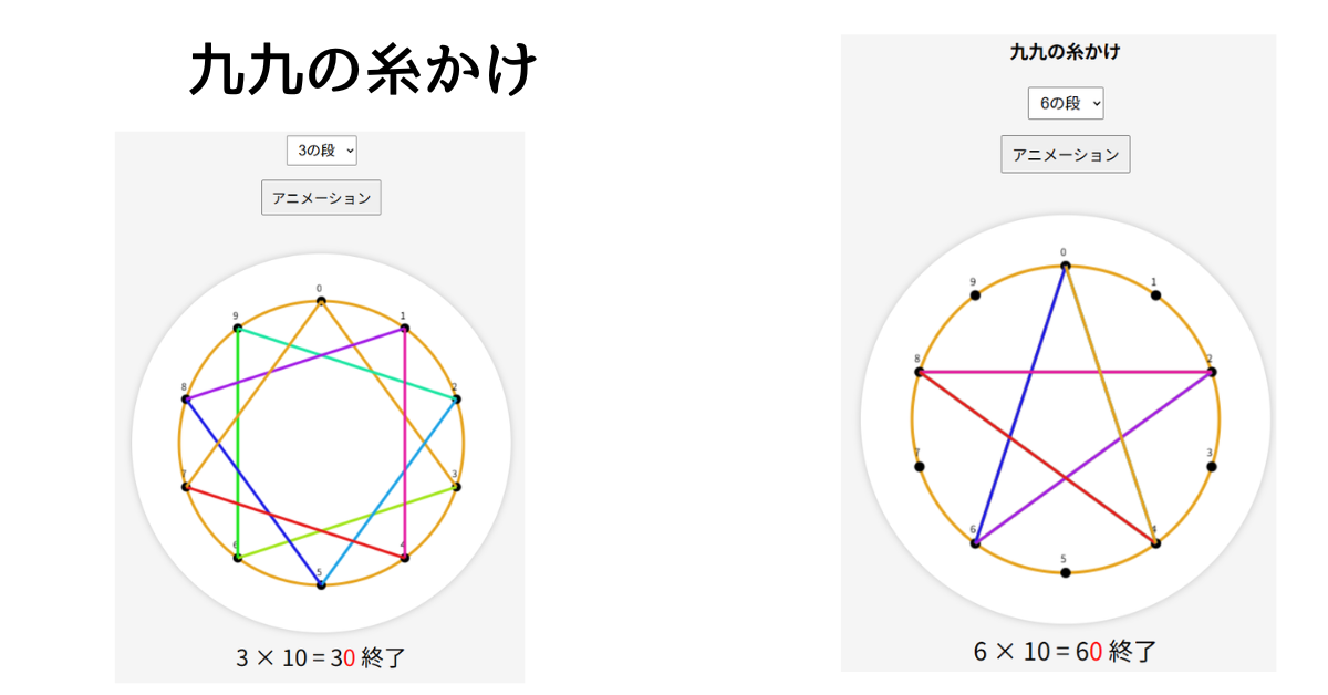 まず、1~9のどの段の模様を描くか選択します。次にアニメーションボタンを押すと、順番に糸がかかっていきます。下にかけ算九九を表示するようにしてみました。
