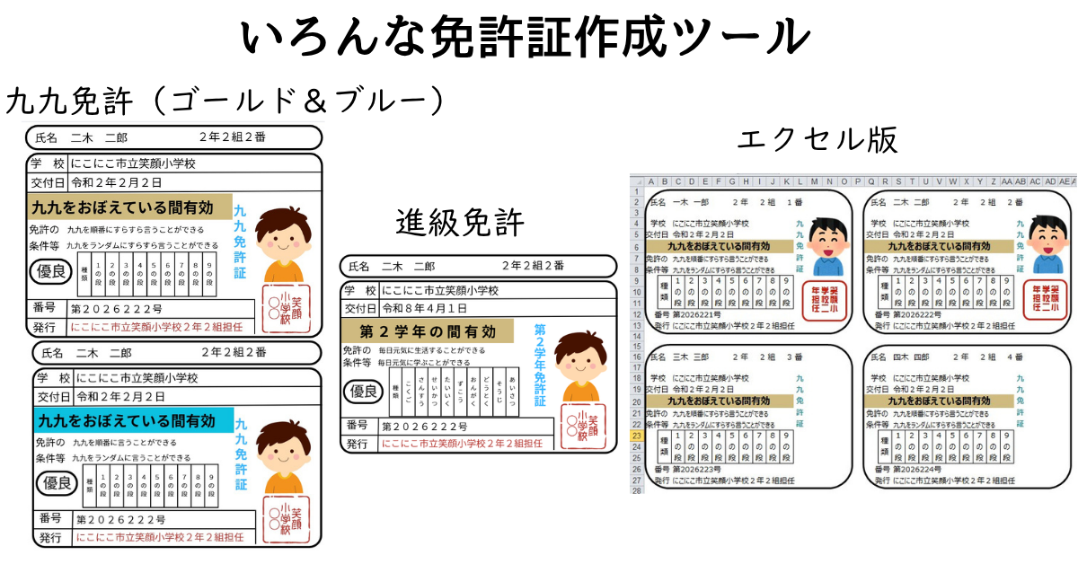 いろんな免許作成ツール 教室ツール X Facebook はてブ LINE Pinterest コピー 2026.04.12 運転免許証に似せたさまざまな免許証を作成できるツールです。小人数にはCANVA版、クラス全員に印刷する時にはエクセル版と2つのバージョンを作成しました。文字等はお好きにカスタマイズしてお使いください。①九九免許 CANVAバージョンはこちらから エクセルバージョンはこちらから②進級免許 CANVAバージョンはこちらから エクセルバージョンはこちらから